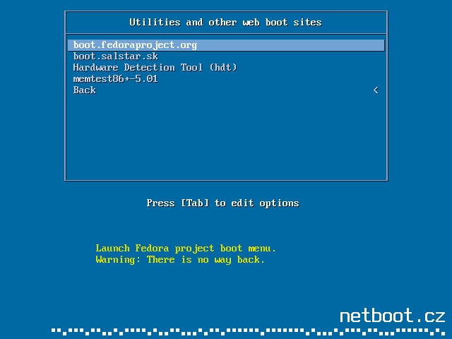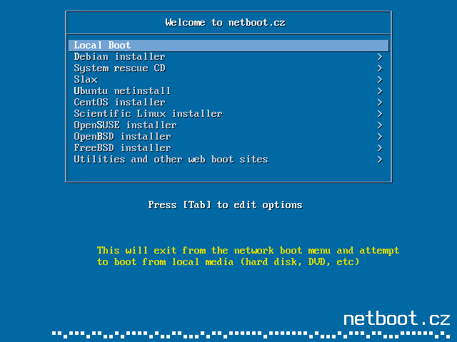 iPXE> dhcp iPXE> chain http://netboot.cz/index.ipxeThis URL can be also used as DHCP filename, for instance with QEMU: